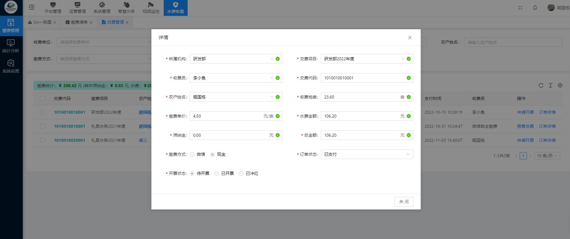 繳費(fèi)信息系統(tǒng):有錄入信息后可進(jìn)行收費(fèi)操作,以消息推送的方式將賬單發(fā)給用水戶,用水戶核對(duì)賬單后可以直接點(diǎn)擊該消息進(jìn)行自主繳費(fèi),也可以代繳;繳費(fèi)完成即推送完成繳費(fèi)消息并提示下載憑證和發(fā)票。